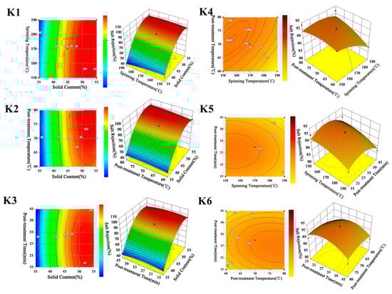 The permeability (permeate flux and salt rejection) could be simulated by the response surfaces data when the counter diagram showed different shapes. In general, the interaction between the parameters was not significant when the counter was circular, which can be neglected, while the factors were significant when the contour was elliptic or saddle [,]. In this work, the diagrams of counter and three-dimensional (3D) surface were fitted to give the interaction effects between the preparation parameters, including solid content (A), spinning temperature (B), post-treatment temperature (C), post-treatment time (D), and permeability (permeate flux and salt rejection).