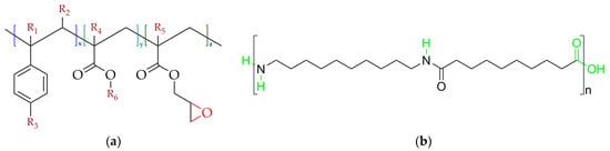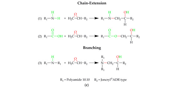 The used polyamide 10.10 (Vestamid® Terra DS 16 natural) with a bio-based content of 100% and a molar mass (Mn) of approximately 20 kg mol−1 was purchased from Evonik Operations GmbH, Essen, Germany. This polyamide 10.10 type shows a specific gravity of 1.05 g·cm−3. The supplier denotes the glass transition and melt temperature of polyamide 10.10 (DS 16) at 37 °C and 200 °C (dry condition). The maximum water absorption at room temperature is specified at 1.8% (Evonik test method). For chain-extension, e.g., branching of the PA 10.10, two different multifunctional Joncryl® types, ADR 4400 and ADR 4468 from BASF SE, Ludwigshafen, Germany (distributed by BTC Europe GmbH, Monheim am Rhein, Germany), are used [31,32]. The general structure of Joncryl® and polyamide 10.10 as well as their chain-extension and branching reaction are shown in Figure 1a–c.