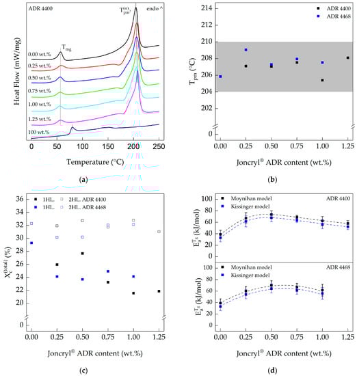 The apparent flow activation energy in the glass transition region is shown in Figure 2d. The measured flow activation energy for PA 10.10 (processed) was 39 ± 7.4 kJ mol−1 (Moynihan model), which is in good agreement with the energy of 42 kJ mol−1 determined by Pagacz et al. [3]. Increasing the Joncryl® content results in an increase in the apparent flow activation energy with a maximum of 73.6 ± 6.6 kJ mol−1 ADR 4400 and 70.1 ± 7.7 kJ mol−1 ADR 4468 at an approx. 0.5 wt.% chain-extender concentration, determined according to Equation (3).