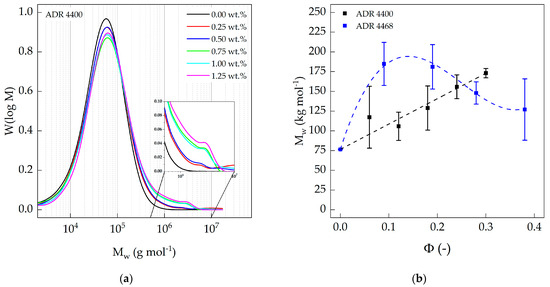 Figure 3a shows the molar mass distribution of PA 10.10 with increasing Joncryl® ADR 4400 content. The average molar mass and molar mass distribution (D) increased with increasing chain-extender (Joncryl® ADR 4400) content. It is known that an overdose of Joncryl® leads to the formation of gel particles, depending on the combination of matrix material and Joncryl® type as well as the equivalent ratio [48,49]. All modified PA 10.10 compounds were completely dissolved in HFIP prior to SEC analysis. Therefore, no gelation occurred during the compounding step. Moreover, the equivalent ratio of PA 10.10 and ADR 4400 or ADR 4468 is relatively low at 0.30 and 0.38, respectively. This means that, statistically, the amount of amino groups (-NH) remaining in the polyamide is much higher compared to the reactive groups of the chain-extender. Furthermore, with increasing content of chain-extenders, a high molecular tail end is formed (Figure 3a). This was also observed by Härth et al. [50,51,52] for PET modified with Joncryl®. The same effects could be observed for epoxy-modified polymers such as PLA [53,54,55] and PA 6 [19].