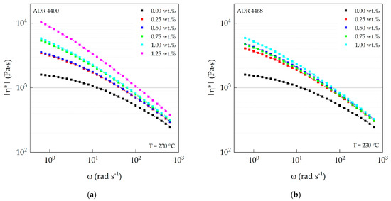 The viscoelastic behavior of the different modified PA 10.10 compounds was analyzed by oscillation measurements. Figure 4a,b show the magnitude of the complex viscosity as a function of angular frequency of the two Joncryl® types ADR 4400 and ADR 4468. The magnitude of the complex viscosity increased with increasing chain-extender content, especially in the low-frequency or shear range (first Newtonian plateau region). This is in good agreement with the average molar mass (Table 5) of the ADR 4400 compounds. At first glance, however, the data of the complex viscosity of the ADR 4468 type contradict the results measured with SEC, which show a maximum of the average molar mass at 0.25 wt.% ADR 4468 content. In comparison, the polymer chains are in the molten state and are not diluted, as required for SEC analyses. As mentioned above, Joncryl® ADR 4468 contains more functional groups than ADR 4400, so the PA 10.10 compounds with ADR 4468 are shorter than those of ADR 4400 due to shear-induced degradation but still have a highly branched structure, which also leads to an increase in viscosity. This behavior was also observed with Joncryl®-modified PBT [59]. In addition, a more branched structure leads to more entanglement and also increases the viscosity in the lower frequency range [60].