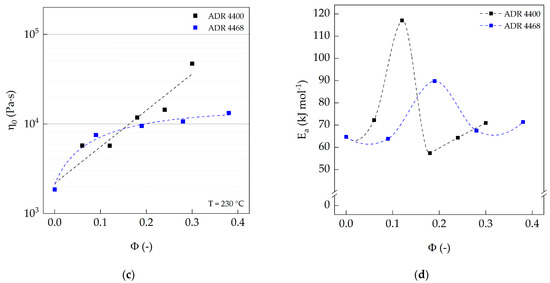 (a) Complex viscosity of ADR 4400–modified and (b) ADR 4468–modified PA 10.10 as a function of angular frequency; (c) zero shear viscosity of ADR 4400– and ADR 4468– modified PA 10.10 as a function of the equivalent ratio; (d) apparent activation energy of the modified PA 10.10 compounds as a function of the equivalent ratio.