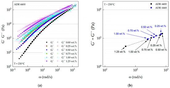 To verify whether chain-extension occurred for both Joncryl® types, the cross-over points of the different compounds were determined by establishing master curves at 230 °C (Figure 5a,b). With an increasing amount of chain-extender, the cross-over point shifts towards lower angular frequencies and moduli. This confirms that as the content of chain-extenders increases, the average molar masses increase and their distribution (D) is broadened. The results from rheological measurements are in a good agreement with the data from GPC measurements for the ADR 4400-modified PA 10.10 shown before. Kamleitner et al. [69] came to the same conclusion for long chain branched (LCB) isotactic polypropylene (iPP).