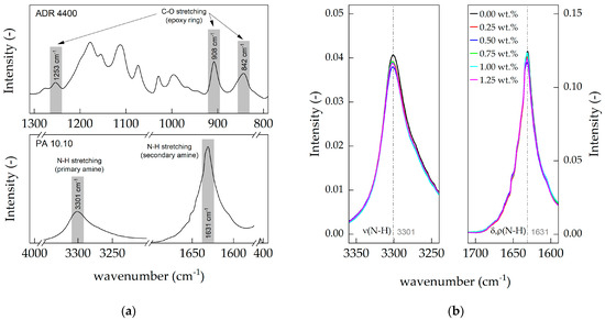 No detectable changes were observed in the compounds at 1255, 910 and 840 cm−1 of C-O stretching in the epoxy ring (Figure 6a). This means that the concentration of Joncryl® was too low to be detected or that all epoxy groups of Joncryl® were consumed during the compounding process, as shown by Costa et al. [57]. As the amount of Joncryl® in polyamide 10.10 increased, the N-H stretching (3301 cm−1) of the primary amine bond decreased (Figure 6b). Zhang et al. [70] came to the same conclusion for polyamide 6. Moreover, the intensity of N-H stretching of the secondary amine at wavenumber 1630 cm−1 also decreased with increasing chain-extender content. Both results indicate that chain-extension (primary amine at 3301 cm−1) and branching (secondary amine at 1600 cm−1) occur simultaneously in polyamide 10.10.
