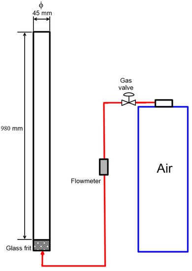 Foamability tests [24] were conducted using the set up described in Figure 1, which consisted of a glass column with a diameter of 45 mm (inner) and a height of 980 mm, a bubble-generator fritted glass disk, an air flowmeter, and a tank of purified air. The tests were carried out using 250 mL of LS solutions prepared at concentrations between 8 and 1600 mg/L (NaLS) and at pH values of 6 and 9. These solutions were conditioned for 15 min before being poured into the column. Then, the foam height was measured as a function of time at given values of air flowrates that varied between 0.6 and 2 L/min, which was equivalent to a range of superficial air velocity (Jg) between 0.62 and 2.10 cm/s. It has to be noted that, in all the experiments, foam height reached an equilibrium at 15 min, the time at which the total gas volume in the foam was calculated as the difference between the foam volume and the 250 mL of solution. All the tests were performed in triplicate and the results reported in this work are average values.