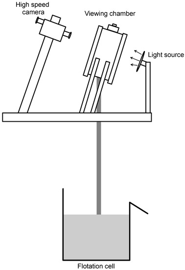 Bubble size distributions in the solution were measured using an image analysis of the bubbles, which were sampled from a flotation cell and photographed using the McGill bubble viewer [25], as described in Figure 2, which shows the experimental set up utilized for these measurements. Bubble images were captured using a Nikon D5100 digital camera (Minato ku, Japan) with a Nikon 60 mm macro lens (4928 × 3264 pixels). Bubbles were generated in a 2.7 L EDEMET flotation cell equipped with control loops to set air flowrate and agitation at 1200 rpm [26].