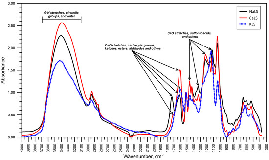 Figure 3 presents the FTIR spectra of the LS samples tested in this work. There are some bands and peaks that are common for the three tested samples: the bands in the range 1600–1700 cm−1, which correspond to C=O stretches associated to carboxylic acids, ketones, esters, aldehydes and others; the bands at 1400–1500 cm−1 assigned to S=O stretches and sulfonic acids; the bands at 1100–1150 cm−1, which can be attributed to S=O stretching; the band at 1000–1050 cm−1, which relates to the presence of sulfonate groups; and the band at 3100–3700 cm−1, which corresponds to O-H stretches, most probably because of the presence of phenolic groups and adsorbed water or water of crystallization. It is important to note that some of the bands that appear in the FTIR spectra of the NaLS and CaLS samples are not shown in the FTIR spectra of the KLS. For example, the bands at 1700–1750 cm−1, which correspond to the C=O stretching vibrations of the carboxyl groups, are suppressed in the KLS sample, which also happens with the bands related to S=O stretching at 1300–1350 cm−1 and 1200–1250 cm−1 [17,18,19,20,28].