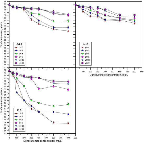 Figure 4 shows the results of the surface tension measurements, obtained as a function of LS concentrations, different values of pH, and in solutions prepared with CaLS, NaLS, and KLS. The experimental results indicate that all the lignosulfonates studied in this work possess substantial surface activity in the studied concentration range, which agrees with previous studies [14,22,28,29,30,31,32,33], and that the most surface-active is the KLS, followed by CaLS and NaLS. Additionally, the surface activity of lignosulfonates is reduced as the pH of the solution increases.