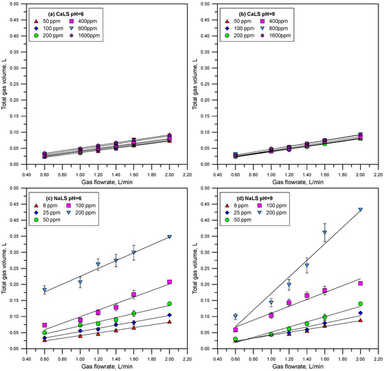Total gas volume vs. gas flowrate at different LS concentrations (CaLS (a,b) and NaLS (c,d) samples) and at pH 6 and 9.