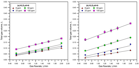Total gas volume vs. gas flowrate at different LS concentrations (KLS sample) and at pH 6 (a) and 9 (b).