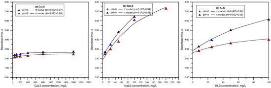 Retention times vs. LS concentration (CaLS (a), NaLS (b), and KLS (c) samples) at pH 6 and 9.