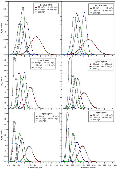 Bubble size distributions obtained using different LS (CaLS (a,b), NaLS (c,d), and KLS (e,f) samples) at pH 6 and 9.