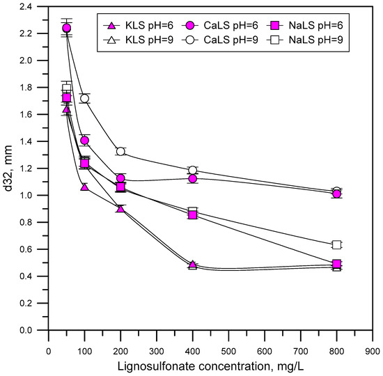 Figure 8 shows the bubble size distributions obtained using different LS samples (CaLS, NaLS, and KLS samples) at pH 6 and 9. Figure 9 shows the Sauter mean bubble diameter D32 at pH 6 and 9 as a function of LS concentration, and Figure 10 shows some images of the bubbles obtained in the experiments. The results show that the KLS is the one that generates the smallest bubble sizes (minimum 0.5 mm), followed by NaLS (minimum 0.5 mm), while CaLS is the one that generates the coarsest bubbles (minimum 1.5 mm). It is important to note that the bubble size values obtained in this study using LS are like those previously obtained using MIBC at 50 ppm in the same type of cell and under similar stirring conditions [26].