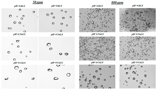 Images of bubbles obtained using different LS (CaLS, NaLS, and KLS samples) at pH 6 and 9.