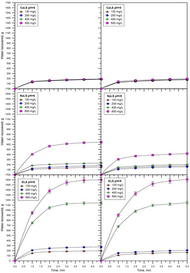 Water recovered as a function of time using different LS (CaLS, NaLS, and KLS samples), and at pH 6 and 9.