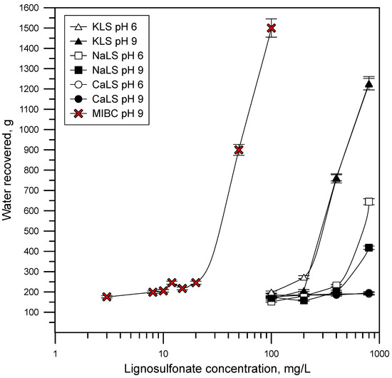 Water recovered at 5 min using different LS (CaLS, NaLS, and KLS samples), and at pH 6 and 9.