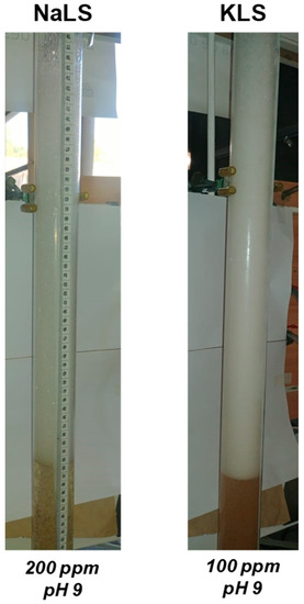 The results presented in Figure 5, Figure 6 and Figure 7 show that the NaLS and KLS lignosulfonates have the strongest foamability effect, while CaLS does not have a significant effect on foam formation. The results of bubble sizes (Figure 8 and Figure 9) show that the KLS lignosulfonate strongly inhibits bubbles coalescence, followed by the NaLS and CaLS lignosulfonates. It was well established that foams are formed by three zones, i.e., a bubble zone, a kugelschaum or sphere zone, and a polyederschaum or polyhedral zone [39]. Figure 13 shows an example of the foam obtained in the experiments with the LS samples tested in this work. In the bubble zone, bubbles move freely upwards and the gas concentration is relatively low; then, in the sphere zone, bubbles still display nearly spherical geometry and are separated by thick films of liquid; in the polyhedral zone, bubbles are separated by thin flat liquid films or lamellas, and the junction points of the interconnecting channels existing between the bubbles are known as Plateau borders [39].