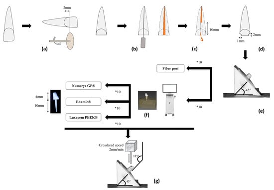 Schematic representation of the different steps of the experimental procedure. Briefly, each incisor’s crown was cut (a) and the tooth treated endodontically (b). Next, 10 mm of the endodontic filling was removed (c), a corono-peripheral preparation was performed (d) and each tooth was embedded in standardized resin mold (e). Among the 40 teeth, 10 received a fiber post, and the 30 others were scanned with an intra-oral scanner to design and produce posts and cores (f) (10 in fiber-reinforced resin, 10 in hybrid ceramic, 10 in PEEK). Once all the restorations were bonded to the endodontic dentin, the samples were submitted to a universal testing machine in a compression mode at a crosshead speed of 2 mm/min (g).