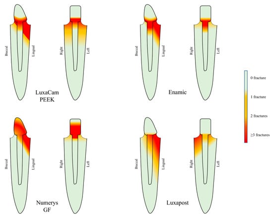 As shown in Figure 2, the fracture feature profiles on the material are mainly located at the post-core junction for the PEEK and Enamic samples. In the Numerys GF® group, fractures are more widespread on the core.