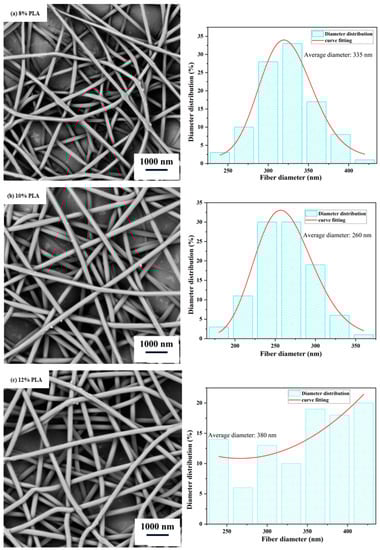 The solution and process parameters are the main factors that affect the morphology of fibers [,]. Excessively high and low viscosity of the solution hinders the stretching of the fibers, leading to poor uniformity. In the electrospinning process, the concentration of the polymer mainly affects the spinnability and the diameter of the fibers. Generally, a higher concentration of the spinning solution results in larger fiber diameter [,,]. Currently, when using PLA for electrospinning, the concentration typically ranges from 8% to 14%. Studies have found that when the mass concentration of PLA is 14%, the viscosity of the spinning solution is too high, leading to clogging of the needle holes and preventing continuous nanofibers. Therefore, experiments were conducted to examine the influence of PLA concentrations of 8%, 10%, and 12% on the morphology of the resulting nanofiber films. From Figure 1, it can be observed that when the PLA concentration is 12%, the diameter distribution of the resulting fibers is uneven, and the fibers tend to stick to each other. This is because the viscosity of the 12% PLA solution is significantly higher than that of the 10% PLA solution (0.432 Pa·S vs. 0.361 Pa·S, Table 1), which hinders the stretching and differentiation of the fibers. When the PLA concentration is 8%, the resulting fibers exhibit a beading phenomenon. This is because the solubility of the solution is low, resulting in weak intermolecular adhesion and insufficient stretching of the fibers []. Therefore, the PLA concentration of 10% (w/w) was chosen, which resulted in an average fiber diameter of 260 nm.