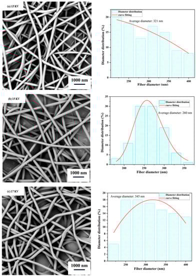 Generally, the spinning voltage affects the shape of the droplets at the needle tip and the flight time of the droplets. When the spinning voltage is relatively low, the spinning solution cannot be effectively stretched, resulting in a larger fiber diameter. Figure 2 shows that as the spinning voltage increases to 15 kV, the solution droplets are well-stretched under the action of the electric field, resulting in a uniform fiber diameter distribution without beading. Increasing the voltage also reduces the solvent evaporation time. Therefore, when the voltage is increased to 15 kV, the strong electric field force minimizes the solvent evaporation, resulting in an uneven fiber diameter distribution and droplet shape on the collector. Therefore, 15 kV is chosen as the appropriate spinning voltage.