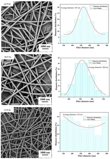 The collector distance primarily affects the flight time of the droplets and the efficiency of solvent evaporation. From Figure 3, it can be observed that when the collector distance increases from 15 cm to 17 cm, the average diameter of the fibers decreases, and the fiber diameter distribution becomes more uniform. This is because increasing the collector distance prolongs the flight time of the droplets, allowing for sufficient stretching of the fibers. However, when the collector distance is set to 19 cm, the non-uniformity of the fiber diameter distribution increases. This is because increasing the collector distance weakens the electric field strength, resulting in a decrease in the surface charge per unit area at the needle tip. As a result, the electric field force acting on the charged droplets is insufficient to overcome the surface tension, leading to increased instability in the fiber distribution. This finding is consistent with the research by Ki et al. []. Therefore, we chose 17 cm as the appropriate collector distance.