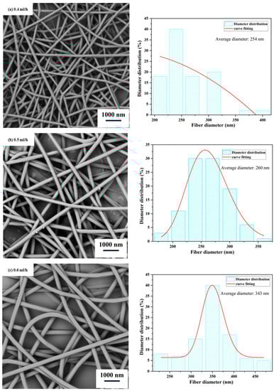 The injection rate affects the volume of the spinning solution. A higher injection rate results in a larger volume of spinning solution accumulated at the needle tip. With a constant electric field intensity and collector distance, this can impact the quality of the Taylor cone formed by the injection needle. It is easier for a spray jet to form smaller droplets, and it requires a longer time for the solvent to evaporate, leading to droplet aggregation and an increase in fiber diameter. From Figure 4, it can be observed that when the injection rate increases from 0.4 mL/h to 0.6 mL/h, the same phenomenon occurs as described above. When the injection rate is 0.5 mL/h, the nanofiber film obtained has a uniform diameter distribution and a smooth surface. Therefore, we choose an injection rate of 0.5 mL/h as the appropriate injection rate.