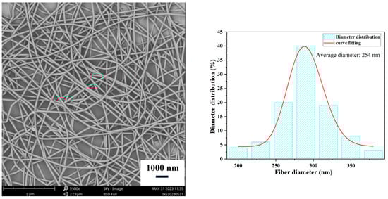 Scanning electron microscope (SEM) images and diameter distribution of the antibacterial nanofiber film under optimal conditions. (Spinning process parameters: Collector distance of 17 cm, solution concentration of 10% (w/w), spinning voltage of 13 kV, and injection rate of 0.5 mL/h).
