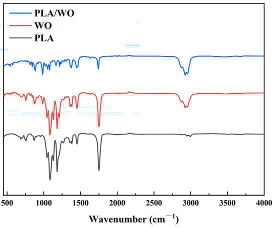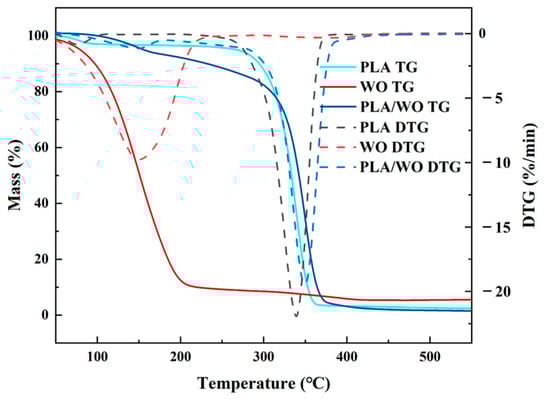 Figure 7 shows the thermogravimetric (TG) and derivative thermogravimetric (DTG) curves of PLA, WO, and PLA/WO materials heated from 30 °C to 550 °C at a heating rate of 10 °C/min. From the graph, it can be observed that all three samples exhibit relatively low mass loss in the initial stage, which is attributed to the presence of a small amount of moisture in the samples. In the TG and DTG curves of PLA, the mass change of PLA begins at 313 °C, with the peak weight loss rate occurring at 339 °C. For WO, the mass change starts at 107 °C, and the maximum weight loss rate is observed at 150 °C. In the case of the PLA/WO curve, the mass loss occurs in two stages. The first stage of weight loss begins at 111 °C, with the maximum weight loss rate observed at 148 °C. The second stage of weight loss starts at 327 °C, and the peak weight loss rate is observed at 350 °C.
