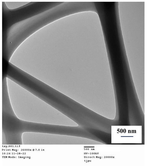 TEM analysis was conducted to observe the morphology of the antibacterial nano-fiber membrane at high resolution. From Figure 8, it can be observed that the antibacterial nanofiber membrane consists of two components. The darker component is WO, while the lighter component is PLA. WO is mixed with PLA, and its dispersion in PLA is random.
