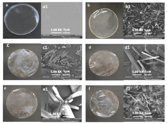 Photographs of bio-nanocomposite films: (a) Neat PVA, (b) PVA+MMt clay, (c) PVA+MMt clay+CNC 2%, (d) PVA+MMt clay+CNC 4%, (e) PVA+MMt clay+CNC 6% and (f) PVA+MMt clay+CNC 8%. SEM images of bio-nanocomposite films: (a1) Neat PVA, (b1) PVA+MMt clay, (c1) PVA+MMt clay+CNC 2%, (d1) PVA+MMt clay+CNC 4%, (e1) PVA+MMt clay+CNC 6% and (f1) PVA+MMt clay+CNC 8%.