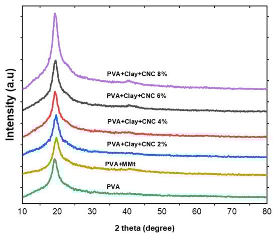 X-ray diffraction (XRD) analysis was carried out in order to ascertain the crystallinity index of the films. The XRD patterns of the neat PVA, PVA+MMt, PVA+MMt+CNC 2%, PVA+MMt+CNC 4%, PVA+MMt+CNC 6%, and PVA+MMt+CNC 8%, are presented in Figure 2. The PVA-based films containing CNCs (2 to 8%) and MMt clay showed a considerable peak in the 2θ range between 18.12 and 22.16°. The outcome of this study shows that the: neat PVA, MMt+PVA, and MMt+PVA+CNC 2% have highly similar crystallinity patterns. The incorporation of MMt, 2% of CNCs did not significantly affect the crystallinity patterns, whereas increasing the CNC content increased the crystallinity of the films: PVA+MMt+CNC 4% resulted in a crystal plane at 2θ = 19.18°, PVA+MMt+CNC 6% at 2θ = 21.42°, and PVA+MMt+CNC 8% at 2θ = 22.16°. Therefore, the intensity of the diffraction peaks increased as the amount of the CNC in the films increased, which suggests that the CNC was successfully incorporated into the films. Identical to our results, Gupta et al. [] and Perumal et al. [] have reported that increasing the amount or concentration of CNC improved the crystallinity pattern. In addition, these studies suggest that the presence of cellulose in the films, in the form of CNCs, is responsible for the improved crystallinity.