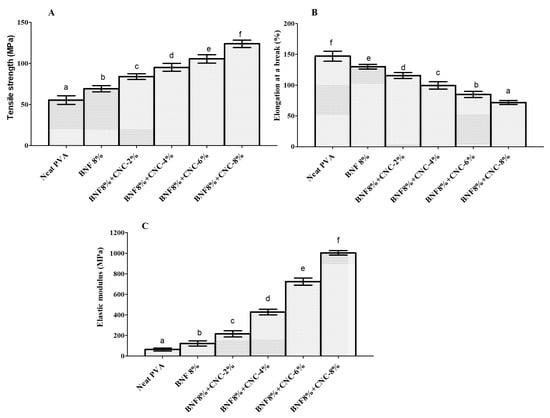 The BNF tensile strengths, elongation-at-break, and elasticity modulus are significantly increased upon the addition of CNCs. As shown in Figure 3A, the tensile strength increased progressively, from 55.1 MPa (neat PVA) to 123.5 MPa [PVA+MMt+CNC 8%]. Similarly, the elongation-at-break reduced from 147% to 71.3%, while Young’s modulus, or modulus of elasticity, abruptly inclined from 63.3 MPa to 1312 MPa, respectively, and these observations are presented in Figure 3B,C. The findings of this study are consistently identical to research studies conducted by Wang et al. [] and Perumal et al. [], in which a rise in the tensile strength and a reduction in the elongation of the films were reported with an increase in the concentration of CNCs. The reduction in elongation might be due to the intense interaction of the higher concentration of CNCs, which resulted in film hardening, and the decreased concentration of CNCs, led to brittle films. According to this observation, the addition of CNC 8% improved the mechanical properties of the BNF. CNC and MMt clay inclusions played an important role in the mechanical properties of the films, and this is related to the uniform distribution of CNCs and the positive interfacial contact of CNCs and MMt clay with the PVA matrix. Singh et al. [] and Achaby et al. [] also, respectively, reported the fact that PVA films recorded increases in the tensile strengths of 5% and 8% with increases in CNC contents. In addition to this, many studies have shown that reinforcing the matrix with MMt clay and with CNC enhanced the tensile strength of the films [,,,,]. Based on the morphological and mechanical studies, the PVA+MMt+CNC 8% bio-nanocomposite was selected for the packaging studies.