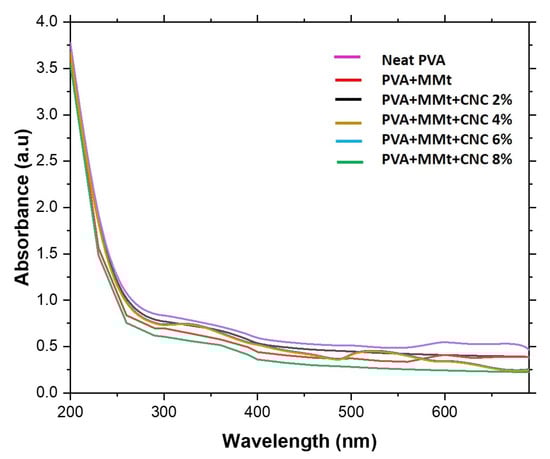 Blocking the harmful wavelength of light is a crucial feature in packing material since UV light energy can lead to oxidation reactions in food that may result in off-flavor and odor. Figure 4 displays the absorption spectra of neat PVA, PVA+MMt, PVA+MMt+CNC 2%, PVA+MMt+CNC 4%, PVA+MMt+CNC 6%, and PVA+MMt+CNC 8% films. All the composition of packaging films has highly absorbed UV light between 200 and 250 nm, and the absorption of UV light has substantially decreased in the UV region (200–400 nm). However, packaging films containing MMt clay-PVA-CNC 8% have minimally absorbed UV light compared with other films. Therefore, MMt clay-PVA-CNC 8% has better UV barrier properties when compared to the other films. This strongly indicates the fact that PVA+MMt+CNC 8% films can function as UV light barriers, and this can prevent the deterioration of food from UV light. Similarly, transparency (visible) is a necessary property of biocomposites for packaging applications since it allows for the visual inspection of the packaged goods. The PVA films have higher transparency value (400–700 nm) than other films, next to the PVA films, PVA+MMt, PVA+MMt+CNC 2%, PVA+MMt+CNC 4%, PVA+MMt+CNC 6% has higher transparency rate. PVA+MMt+CNC 8% has lower transparency than the other films, and the transparency of the packaging film was slightly influenced by adding CNC-8%. Although PVA+MMt+CNC 8% film has lower transparency, it did not affect the visual view of the food product. Similar to our study, Yadav et al. [] found that increasing the concentration of CNC in PVA could effectively act as a UV barrier. In addition, according to Zhang et al. [], CNC reinforcement reduced UV absorption in PVC thin films. Sukyai et al. [] reported that the integration of MMt clay into a food packaging film reduced the transmission of UV light in the film, and it served as a UV barrier. In addition, the neat PVA+MMT+CNC 8% film had a lower transmittance value than the PVA film, which resulted in a lower transmittance, and hence, the transparency of the PVA matrix was slightly influenced upon its mixing with CNC and MMt. However, the lower transparency in the PVA+MMt+CNC 8% films did not affect the visual inspection of packaged goods.
