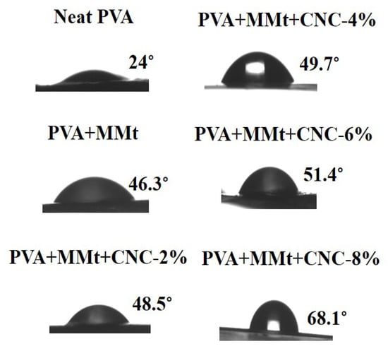 The contact angle of the film samples is displayed in Figure 5. A contact angle of 24° was visible on the clean/neat PVA film. This phenomenon illustrates the PVA matrix’s hydrophilic and wettable properties. MMt was included in the PVA matrix, which changes the contact angle from 24° to 46.3°, i.e., it was dramatically raised for the PVA-MMt matrix. In addition, after the CNC fillers (2, 4, 6, and 8%) were added to the PVA-MMt matrix, the nanocomposites’ contact angles increased. However, the 2, 4, and 6% concentrations of CNC showed minimal impact on the improvement of hydrophobicity. The films, which integrated 2 to 6% CNC contents, had their contact angles increased from 48.5° to 51.4°. When the CNC content was increased from 2 to 8%, the hydrophobicity of the film increased drastically. The contact angle of the PVA+MMt+CNC 8% film recorded a 68.1° value, which is the highest among all the samples. Based on the results of this study, the PVA/MMt/CNC-8 sample recorded the best hydrophobicity of all the films. Identical outcomes demonstrated that the hydrophobicity of nanocellulose and alginate-based films increased when CNC was added []. He et al. [] investigated the hydrophobicity of carboxy methyl cellulose and MMt-based films, and the results showed that the incorporation of MMT clay into the carboxy methyl cellulose matrix significantly enhanced the hydrophobic nature of the films. Therefore, the combination of MMt and CNC-8 enhanced the hydrophobicity of the films.