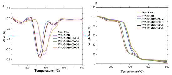 The TGA (Thermogravimetric analysis) and DTG (Derivative thermogravimetric) plots, shown in Figure 7A,B, were used to analyze the BNFs thermal stability, following the addition of MMt clay and CNCs. From each of these plots, it can be seen that the films degraded in stages across a wide temperature range between 50 °C and 800 °C. The BNF degraded in two stages, and the BNFs initial thermal deterioration stage took place between 50 °C and 150 °C, which was caused by the deterioration of the low molecular weight compounds and moisture evaporation. The second stage of the BNF degradation occurred from 200 to 300 °C. Significant weight losses for all the samples can be observed, and this observation is represented in Figure 7. The side chain breakdowns of PVA, glycerol, and CNC are the causes of weight loss in the first and second stages. The major chains of PVA degraded at a higher rate in the third stage of thermal degradation, which occurred between 325 °C and 450 °C. This is a result of the cyclization reaction and the continuous removal of the remaining acetate groups. The PVA+MMt+CNC 8% composite film, with a Tmax of 400 °C, demonstrated greater thermal stability than other films, notably in the temperature range between 400 °C and 450 °C. The PVA+MMt+CNC 8% recorded higher thermal degradation than the PVA+MMt+CNC 2%, PVA+MMt+CNC 4% and PVA+MMt+CNC 6% films. The thermal degradation profiles of all the films are similar. However, the thermal degradation of PVA+MMt+CNC 8% slightly decreased compared with the other films. This is believed to be the result of the creation of a denser network, brought about by the addition of a high amount of CNC to the PVA/MMt mixture. In addition, MMt clay and CNC to the PVA increased the tensile strength, elongation, hydrophobicity, and crystallinity of the films. Based on this study, it is obvious that the MMt clay and the rising CNC concentration moderately enhanced the thermal stability of the films. Similar outcomes were reported by Kang et al. [], who found that the inclusion of CNC-8%, derived from wheat bran, significantly enhanced the thermal stability of the biocomposite films under study. Oun et al. [] observed that the thermal stability of films made by the addition of CNC to the polyvinyl alcohol matrix was marginally improved. Similar to our results, Lizundia et al. [] proved that the addition of CNC slightly improved the thermal stability of films under investigation; however, it did not majorly influence the thermal stability of films.