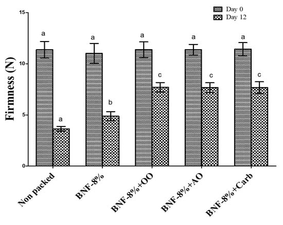 Firmness of treated sapota fruit from Day 0 to Day 12. The lower-case letters indicate the mean values with significant differences between the packaging of fruits according to Duncan’s test (p < 0.05).