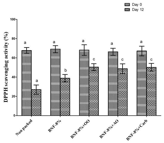 Antioxidant activity of treated sapota fruit during storage at ambient temperature between Day 0 and Day 12 of storage. The lower-case letters indicate the mean values with significant differences between the packaging of fruits according to Duncan’s test (p < 0.05).