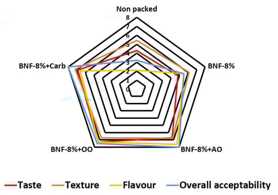 At the end of the 12th day of storage, the sensory qualities of the treated and untreated fruits were evaluated in terms of the following criteria: flavor, texture, taste, and overall acceptability. After the storage periods, the packages were kept open for the EO vapors to escape. The sensory characteristics of BNF 8%+OO, BNF 8%+AO, and BNF 8%+carbendazim showed a better acceptability rate compared with the BNF 8% and non-packaged sapota fruit, as shown in Figure 11. However, the BNF 8% packaged and non-packaged fruits recorded the lowest sensory score, but the sensory score for the BNF 8% was better than that of the non-packaged fruits. In addition, the bio-nanocomposite packaging, integrated with essential oil, such as lavender, clove, sage, and thyme on strawberries, tomato, citrus, and table grapes, did not affect the sensory characteristics [,,,,,,,,,].