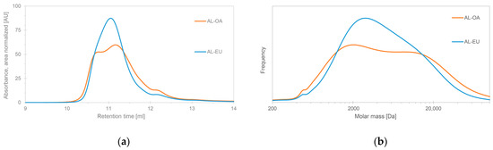 HP-SEC chromatograms (a) and molar mass distributions (b) of the isolated acidolysis lignins from oak (AL-OA) and eucalypt (AL-EU).