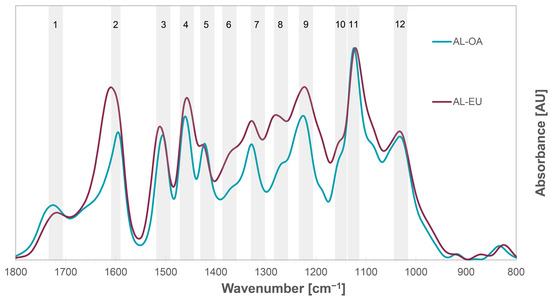 FTIR spectra of the isolated acidolysis lignins from oak (AL-OA) and eucalypt wood (AL-EU). The respective signal assignments of the IR band numbers are given in Table 3.