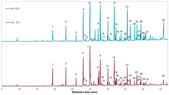 Pyrograms of the isolated acidolysis lignins from oak (AL-OA) and eucalypt wood (AL-EU). Peak numbers refer to the pyrolysis products listed in Table 4.