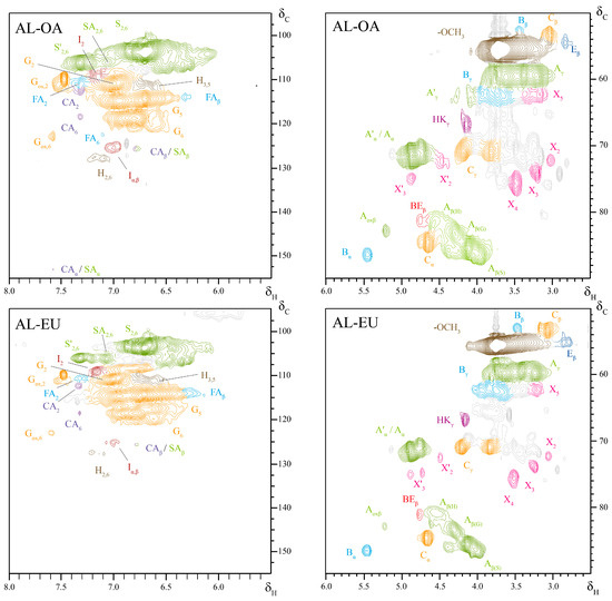 Two-dimensional 1H-13C heteronuclear single quantum coherence (2D HSQC) NMR spectra were recorded on a Bruker AVANCE 600 spectrometer operating at the proton frequency of 600.13 MHz with a z-gradient probe using 50 mg of the lignin samples in 700 µL DMSO-d6. The HSQC experiments were acquired using a time domain of 1024 data points in the F2 dimension (1H) and 512 data points in the F1 dimension (13C). A 1JC-H coupling constant of 145 Hz and spectral widths of 12 ppm and 220 ppm in the 1H- and 13C-dimensions, respectively, were used applying 128 scans with a recycle delay of 3 s. For a semi-quantitative analysis, the integrals of the C-H cross-peaks were determined and compared using MestReNova v6.0.2 software (Mestrelab Research S.L., Santiago de Compostela, Spain). Signal assignment was conducted according to the literature [31,32,33,34,35,36,37]. The monomeric ratio of the AL fractions was estimated from the C2-H2 correlations from syringyl (S), guaiacyl (G), and p-hydroxyphenyl (H) lignin subunits as well as ferulic acid (FA) groups in the aromatic region of the HSQC spectra. The Cα-Hα correlations were used for the determination of the relative abundances of the different lignin inter-unit linkages as well as the ratio of stilbene structures.