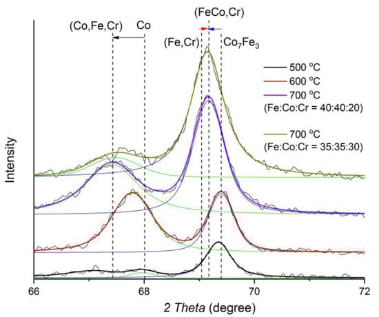 With an increase in the synthesis temperature from 500 to 700 °C, due to the reduction of oxides and coalescence of nanoparticles, a triple solid solution based on the cobalt FCC lattice begins to form. There is a shift in the reflex maxima to the region of small angles, which indicates an increase in the crystal lattice parameter due to the formation of an unordered solid solution of iron and chromium in cobalt (Figure 2). The intensity of the reflexes in the BCC and FCC phases increases, which indicates an increase in the average size of the coherent scattering region (CSR). A comparison of the obtained results with the state diagram for the triple Fe-Co-Cr system [39] showed almost complete correspondence of the phase composition. In the diagram, at the given values for the relative metal content, FCC- and BCC-solid solutions are clearly distinguished.