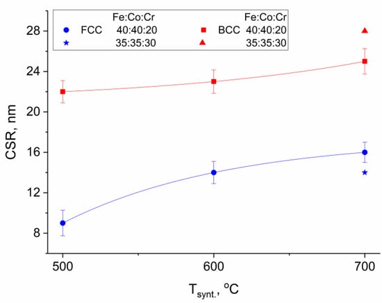 Figure 3 shows the dependence of the average size of the CSR of nanoparticles of alloys with different crystal lattice types on the synthesis temperature.