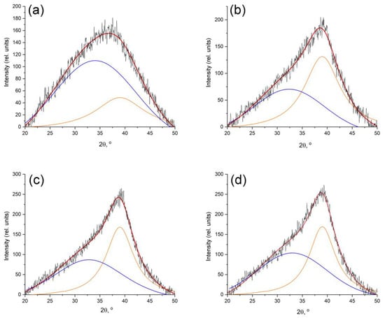 Deconvolution of the peak of the d002 plane—the peak of the carbon matrix of nanocomposites synthesized at different temperatures: (a) 500 °C; (b) 600 °C; (c) 700 °C; (d) 700 °C (Fe:Co:Cr = 35:35:30).