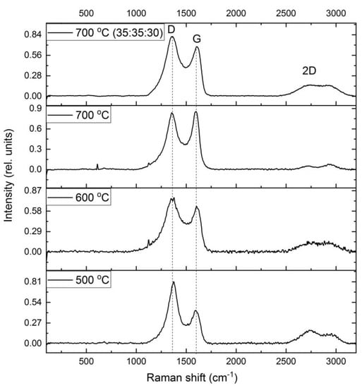 It is known that, depending on the microstructure of a carbon-containing material, the position of the maxima of the D- and G-bands change, as well as their intensities in the RAMAN spectrum [40,41,42].