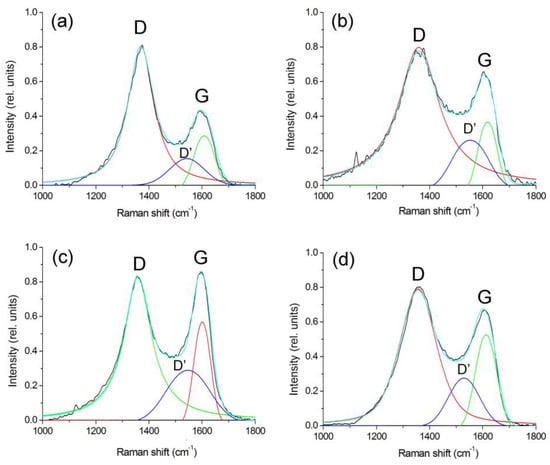 The Raman spectra were analyzed using the method of decomposition into three peaks (Voigt function and Gauss function): D, G, and D’ (Figure 6). The results of the calculations using this technique are presented in Table 2.