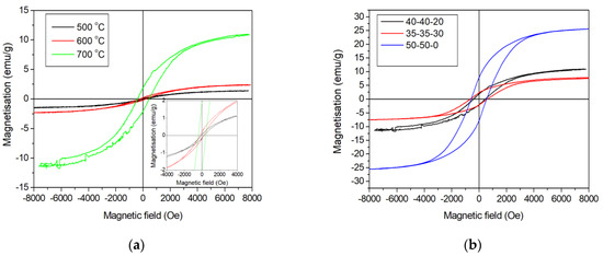 An analysis of the magnetic properties of nanocomposites (Figure 7) FeCoCr/C showed that with an increase in the synthesis temperature, the values of specific magnetization and coercive force increase (Table 3).