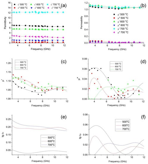 Frequency dependences of complex dielectric (a), magnetic (b–d) permeabilities and tangent of dielectric (e) and magnetic (f) losses on the synthesis temperature of nanocomposites FeCoCr/C (Fe:Co:Cr = 40:40:20).